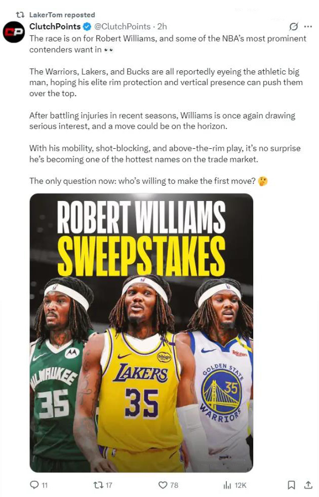 与此同时,据美媒《ClutchPoints》报道:开拓者已经将罗伯特·威廉姆斯摆上交易货架,这引起湖人、雄鹿、勇士等球队注意。